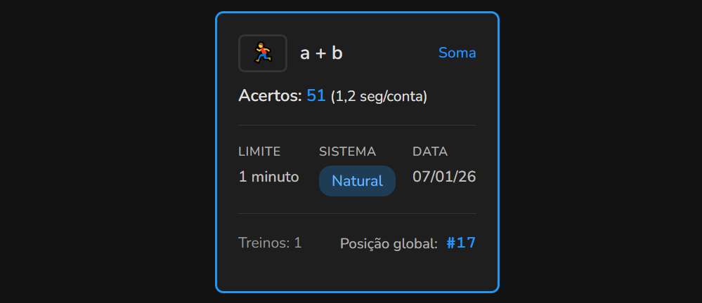 Tem vários níveis de dificuldade, começando com somas de um algarismo. Mas tem todas as operações básicas soma, subtração, multiplicação, divisão e raiz quadrada. E você pode fazer contas com números naturais, inteiros, decimais, romanos, binários ou hexadecimais!